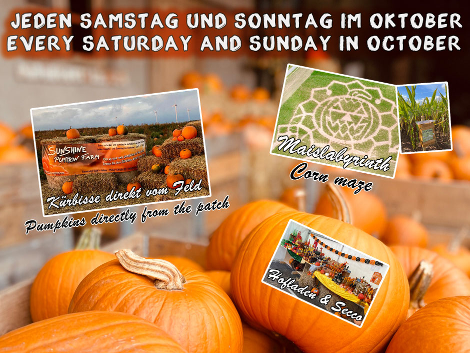 Es sind das Kürbisfeld, Maislabyrinth und der Hofladen geöffnet. Auf unserem Hof gibt es ein vielfältiges Essensangebot.